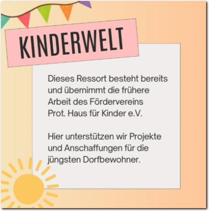 Dieses Ressort besteht bereits und übernimmt die frühere Arbeit des Fördervereins Protestantisches Haus für Kinder e.V und bleibt fester Bestandteil unserer Vereinsarbeit.